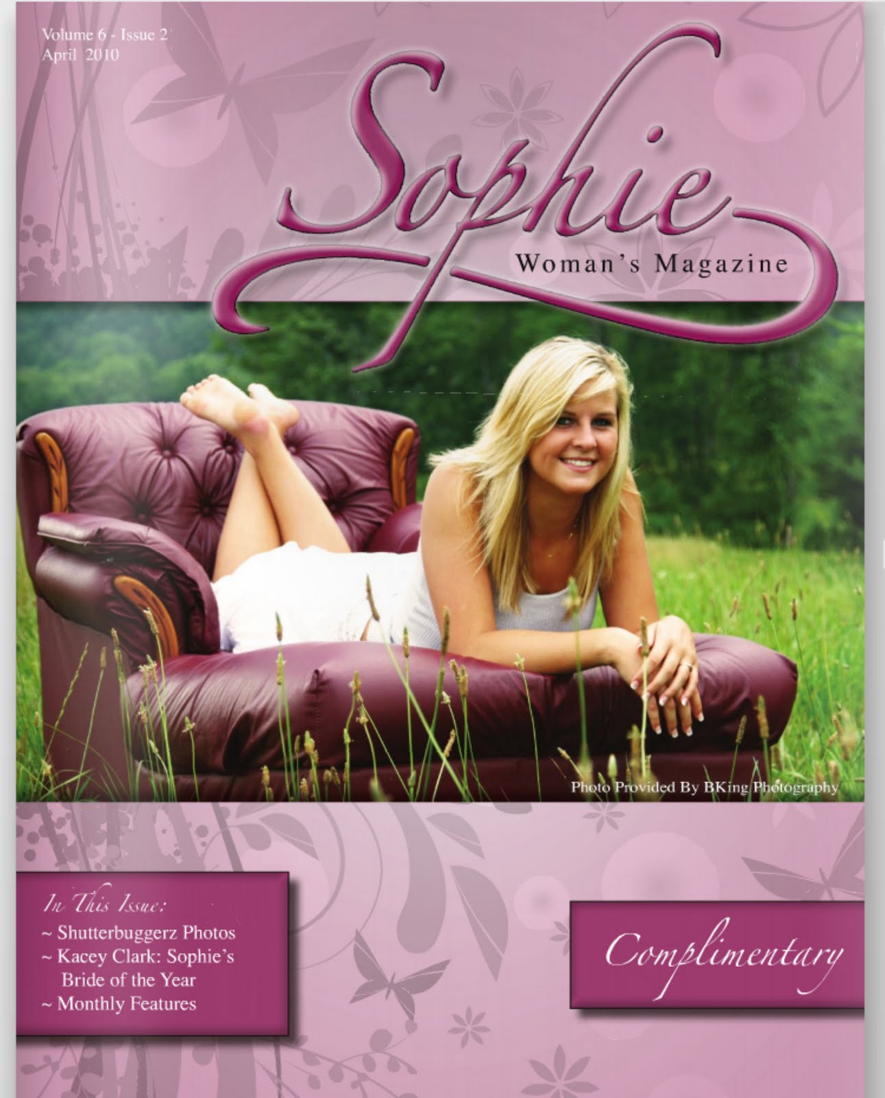 I was recently informed that one of my photos had been chosen for the cover of the April Sophie Woman's Magazine. Needless to say, I was ecstatic. I had submitted six photos from several of my clients to the shutterbuggerz contest in March. I was contacted and asked if the photo of Katelyn Schoenen could be used for their April cover. Of course, I said yes, lol ! I am completely honored that they would choose one of my photos. It is humbling that some of my work would get this attention. The Sophie magazine is published monthly, and is a regional magazine, out of Conover, NC. The magazine contains great articles, as well as photos from professional and amateur photographers in the area. You may pick one up at local restaurants, car dealerships, grocery stores, and many physician's offices. Thanks again to Sophie for choosing my photo, and thanks to Katelyn for being such a beautiful model. You may check out the magazine online at http://sophiewomansmagazine.com/.